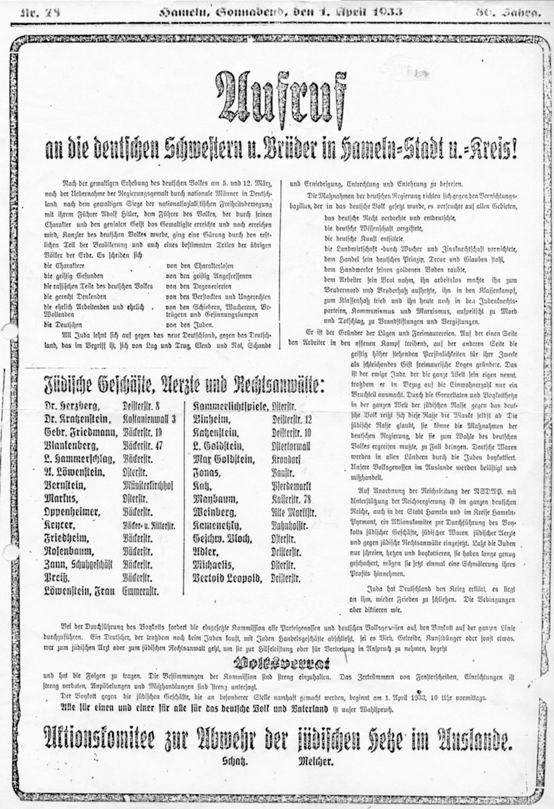 "Aufruf an die deutschen Schwestern und Brüder in Hameln Stadt und Kreis. Juda hat Deutschland den Krieg erklärt." Der Boykott dient der "Abwehr der jüdischen Hetze im Auslande. ... Ein Deutscher, der trotzdem noch beim Juden kauft, begeht Volksverrat."