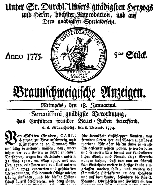 In der Verordnung gegen Betteljuden, Braunschweig 1775, heißt es: