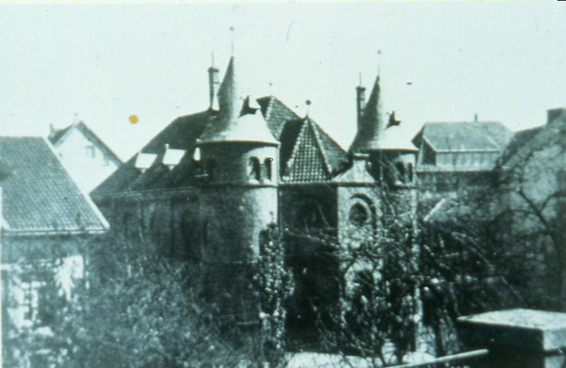 Dieses älteste vorhandene Foto der Synagoge stammt aus der Zeit um 1900. Vor dem linken Treppenturm ist deutlich eine der beiden Pyramideneichen zu sehen, die anlässlich der Einweihung gepflanzt worden sind.