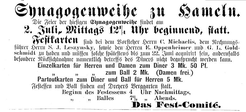 Am 2. Juli 1879 wurde die Synagoge der Hamelner jüdischen Gemeinde mit einem Festakt unter großer Beteiligung der Hamelner Bürger feierlich geweiht. Nicht einmal 60 Jahre sollte dieses Bauwerk alt werden.